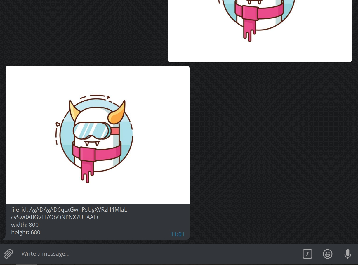 Amazing! Now we know photo's file_id so we can send them by file_id. Lets make our bot answer with that photo when we send command /pic